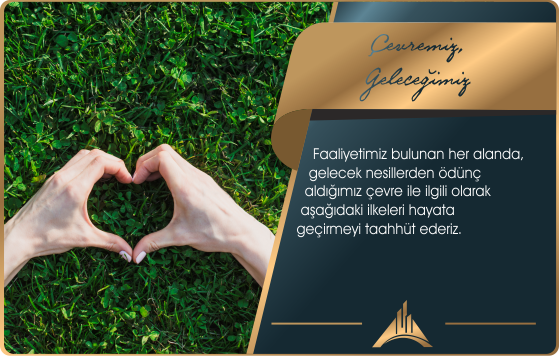 Arşah Yapı, en üst kalite seviyesinde üretim faaliyetlerini yürütürken doğal çevrenin korunmasını da amaç edinmiştir. Bu bağlamda faaliyetimiz bulunan her alanda, gelecek nesillerden ödünç aldığımız çevre ile ilgili olarak aşağıdaki ilkeleri hayata geçirmeyi taahhüt ederiz.